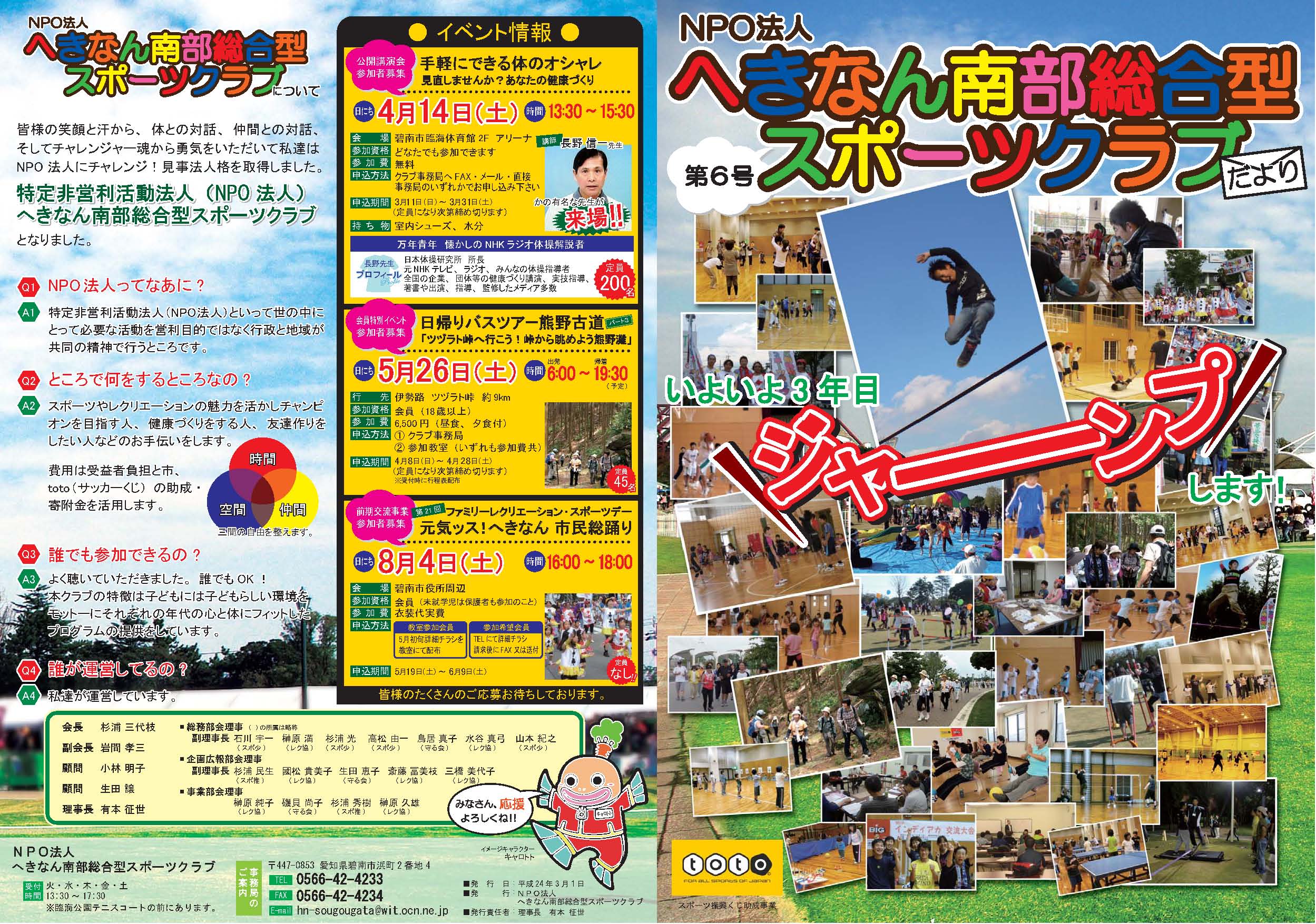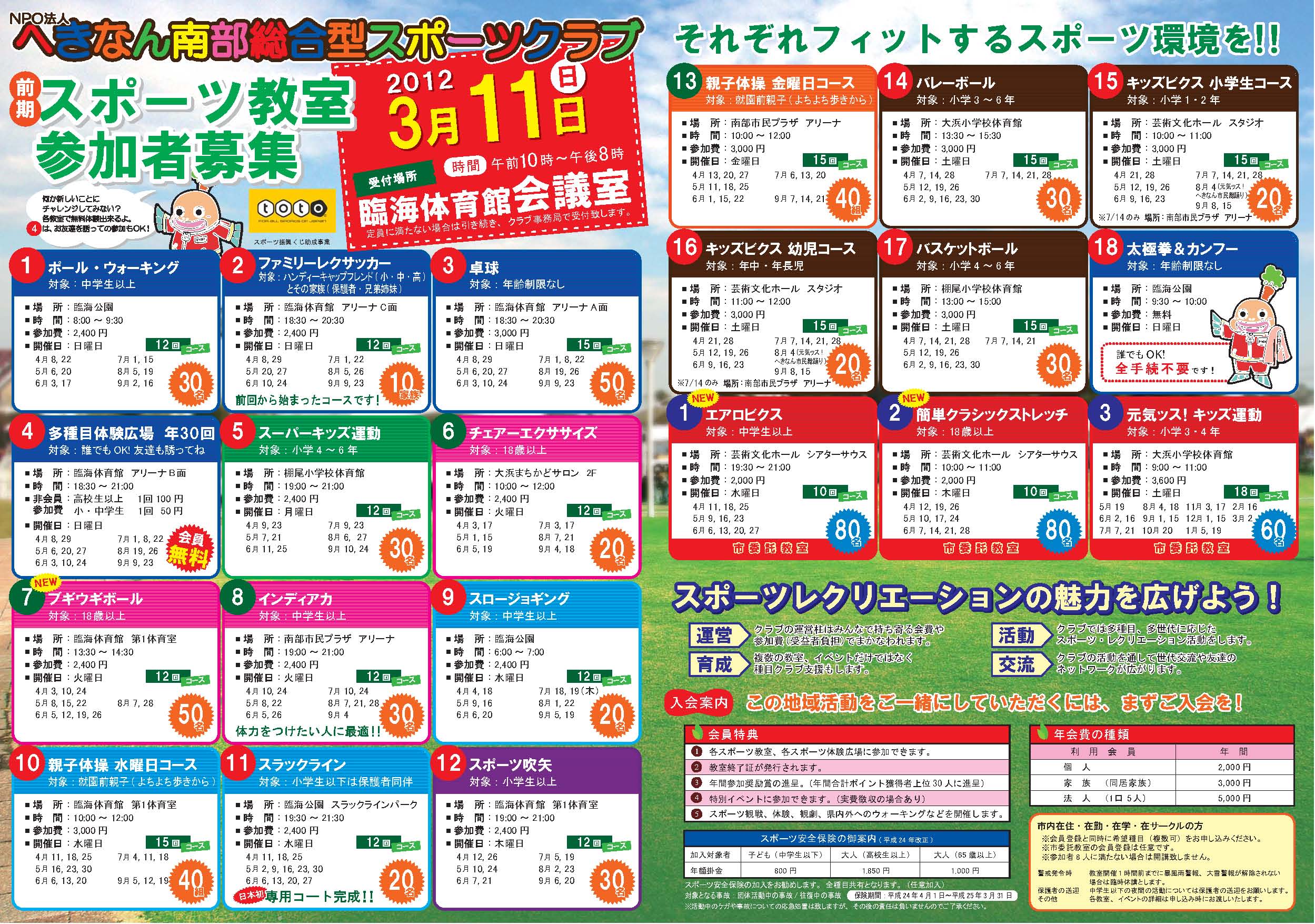 NPO法人 へきなん南部総合型スポーツクラブ ☆24年度 前期スポーツ教室 開催日 : 水曜日 <12回コース> 4/11・18・25, 5/2・9・16・23・30, 6/6・13・20・27 場所 : 臨海公園 スラックラインパーク 住所 : 愛知県碧南市浜町2-4 時間 : pm19:30 ~ pm21:30 対象者 : 小学生以上 (小学生は保護者同伴) 定員 : 20名 参加費 : 2,400円 ※入会費が必要となります。 詳しくは、下記のPDFデータをご覧下さい。 ☆教室の申込み日 申込日 : 3/11 日曜日 場所 : 臨海体育館会議室 時間 : am10時 ~ pm20時 ※定員になり次第、募集は終了となりますので、 お問い合わせは事務局までよろしくお願いします。 【 事務局のご案内 】 ● NPO法人 へきなん南部総合型スポーツクラブ HP ※臨海公園テニスコート前にあります。 開設日は火曜日~土曜日 pm13:30~pm17:30 スラックラインを知ってる人も、知らない人も、興味を持たれた方は是非、この機会にふるってご参加下さい。 スラックラインは簡単に言うと綱渡りですが、バランス感覚が養えます。みんなで一緒に楽しくスポーツしましょう。 依頼先 : NPO法人 へきなん南部総合型スポーツクラブ |