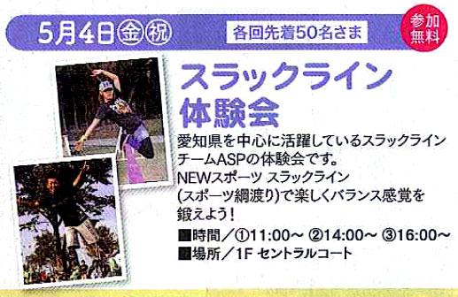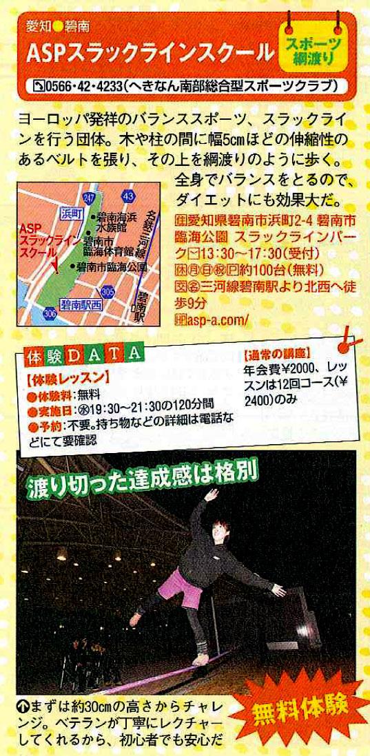 3/27発売の東海ウォーカーにASPが掲載されます。 これから暖かくなってきて、何かはじめてみたい方、スラックラインに興味を持ってくれた方、みんなで一緒に汗をかいてリフレッシュしましょう。 依頼先 : 東海walker |